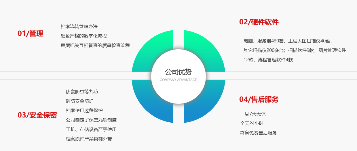 海創(chuàng)卓遠(yuǎn)秉承“安全、數(shù)量、質(zhì)量”的服務(wù)理念,不斷致力于檔案信息化產(chǎn)業(yè)的傳承及研發(fā),現(xiàn)已在檔案信息化方面擁有專業(yè)的數(shù)字化加工技術(shù)和先進(jìn)的檔案數(shù)字化加工設(shè)備。公司的研發(fā)團隊已自主研發(fā)了一系列檔案數(shù)字化加工檢查系統(tǒng)和電子檔案導(dǎo)入檔案管理系統(tǒng)的軟件,并得到了廣泛的應(yīng)用,極大的提高了檔案數(shù)字化的加工效率、質(zhì)量和準(zhǔn)確度。公司擁有先進(jìn)的價值900多萬的檔案整理和數(shù)字化加工硬件設(shè)備和軟件系統(tǒng),能滿足各種檔案的數(shù)字化加工需求。年檔案整理和數(shù)字化能力1億頁以上,可隨時根據(jù)客戶檔案的類別、數(shù)量和周期來配備相應(yīng)的技術(shù)人員和生產(chǎn)流水線,確保按期保質(zhì)保量的完成檔案整理歸檔和數(shù)字化加工服務(wù)。