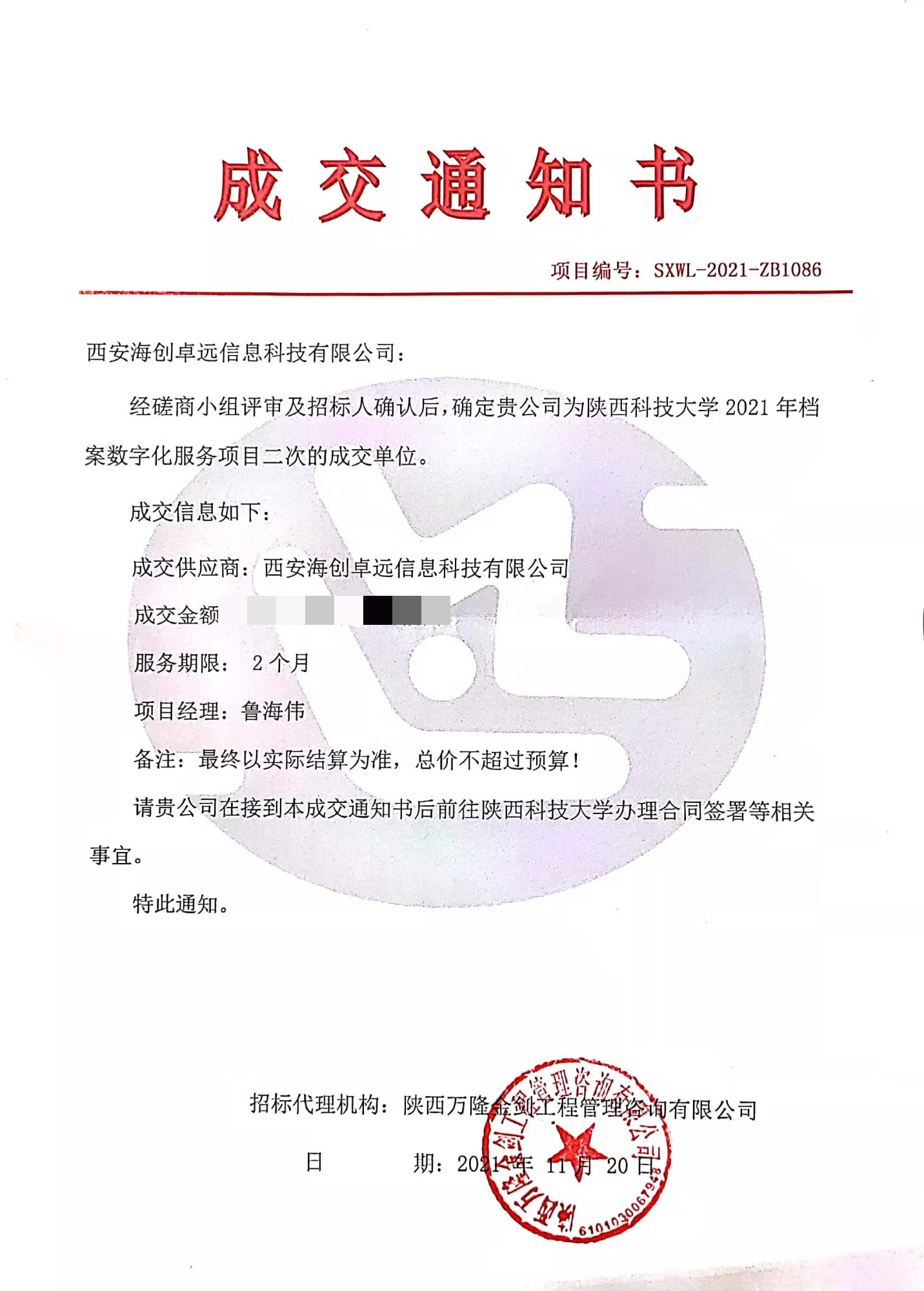 西安海創(chuàng)卓遠信息科技有限公司本著誠信鑄就品質(zhì)、創(chuàng)新引領未來的經(jīng)營理念,以豐富的經(jīng)驗和精湛的技術,在參與的陜西科技大學檔案數(shù)字化項目中獲得專家認可,成功中標!